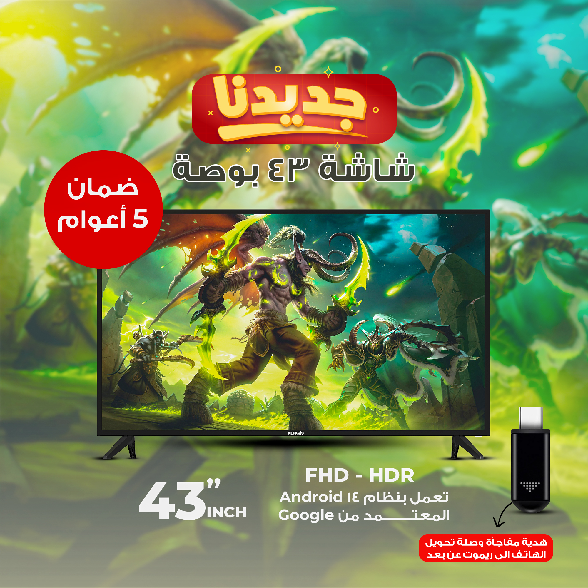 شاشة سينمائية ذكية 43 بوصة + هدية مفاجأة وصلة تحويل الهاتف الى ريموت عن بعد