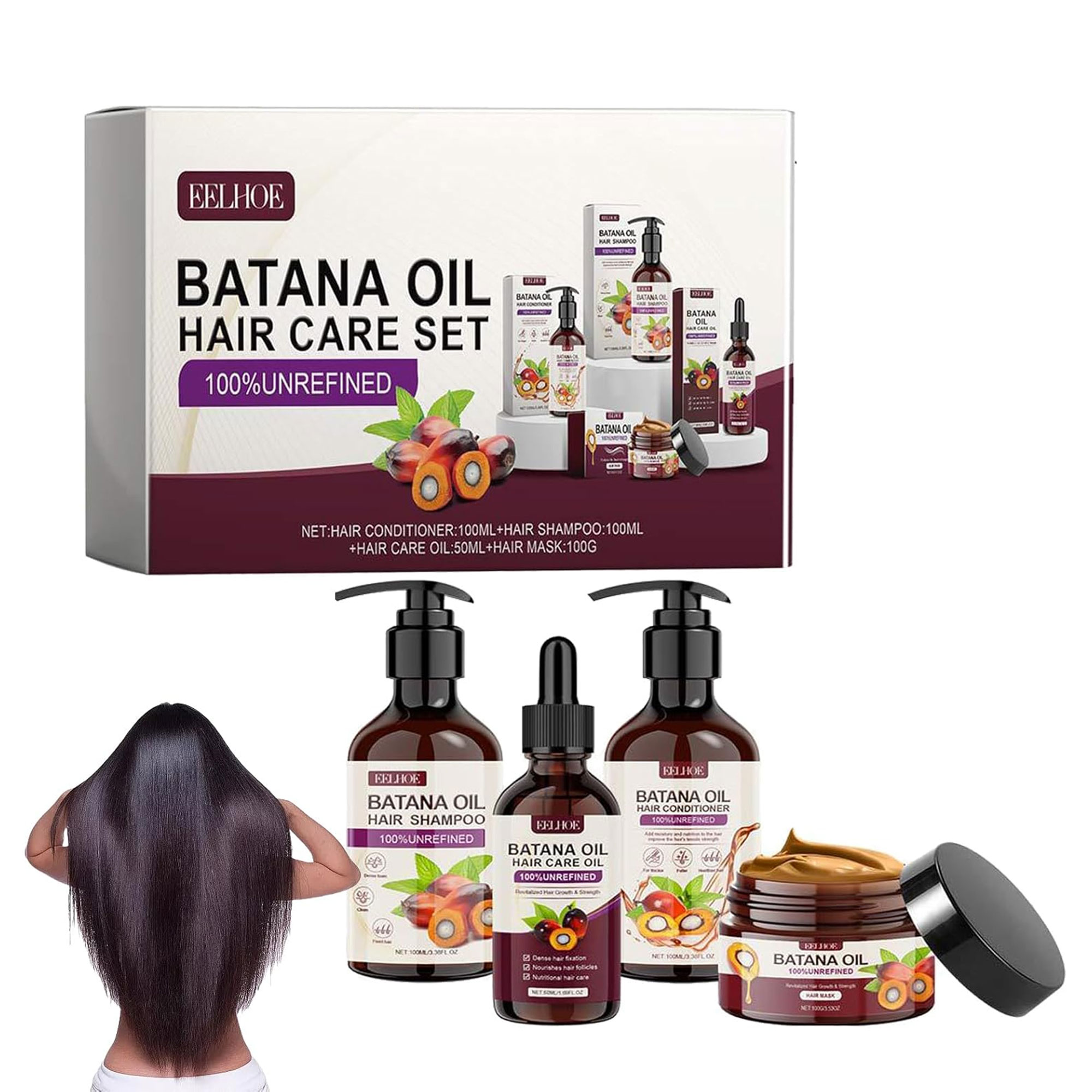 الحجم: شامبو 100 مل – بلسم 100 مل – ماسك 100 جم – زيت شعر 50 مل