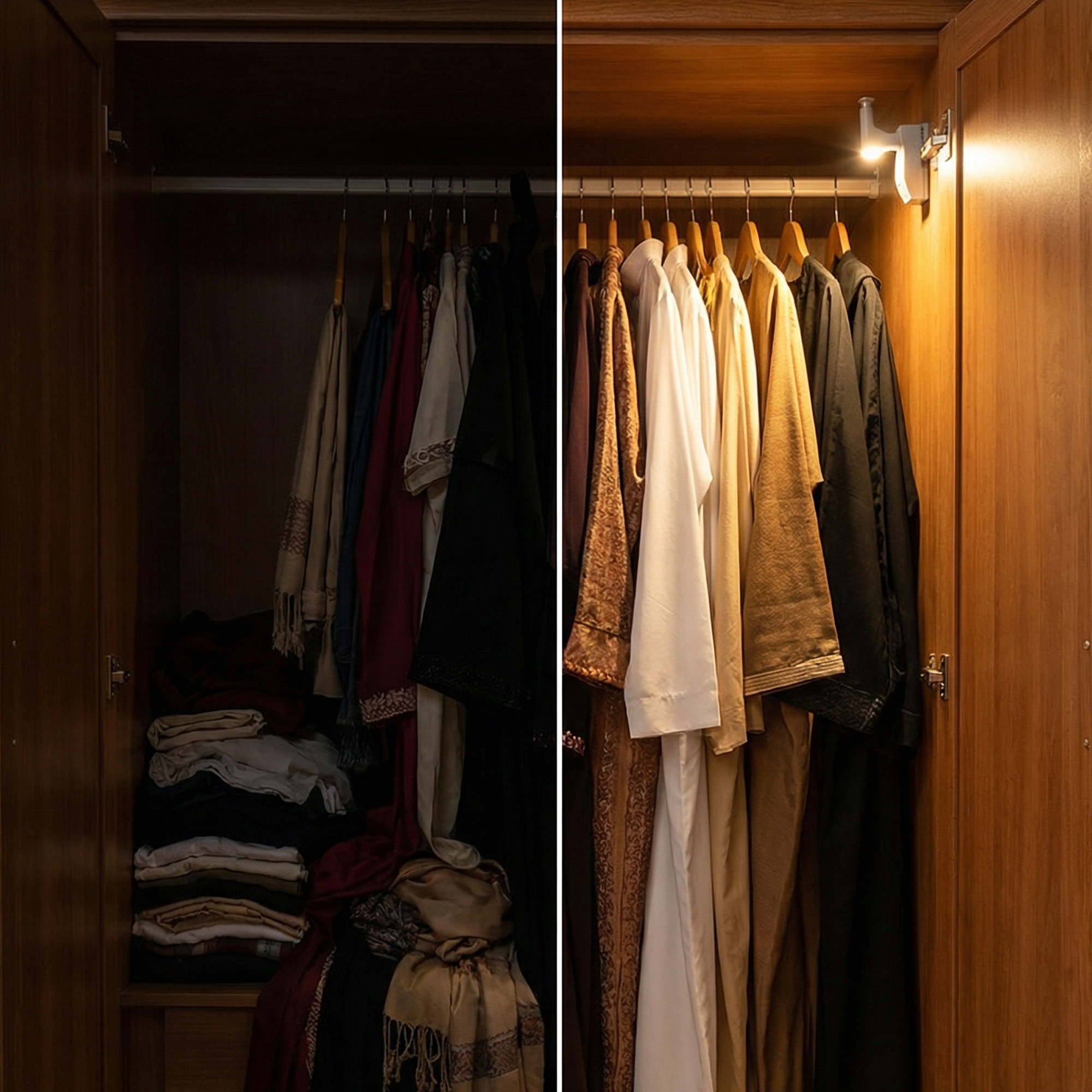 زاوية إضاءة دافئة تضيف لمسة جميلة وخفيفة على خزانتك